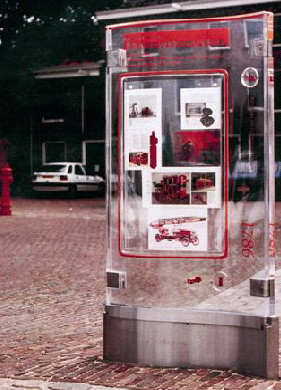 Transparante informatietableau in de vorm van een bladzijde voor verwisselbare inhoud. Van acrylaat en roestvrij staal. Standplaats: Hellevoetsluis. Opdrachtgever: Gemeente Hellevoetsluis, i.s.m. Culturele Raad Zuid-Holland (1996).